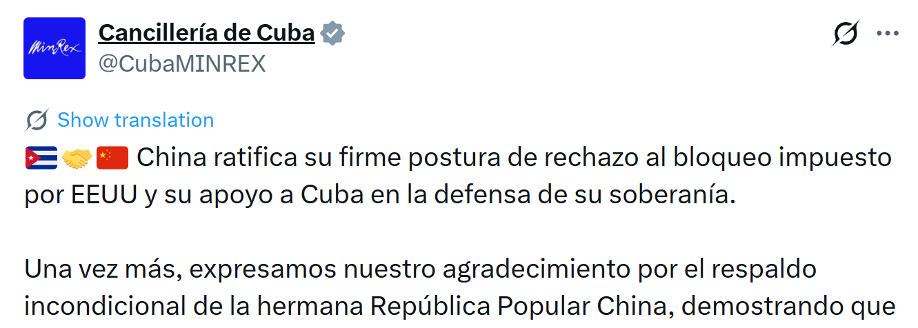 古巴外交部表示,中方重申反对美国对古封锁的坚定立场,并支持古巴维护国家主权。“这表明古巴并不孤单。”